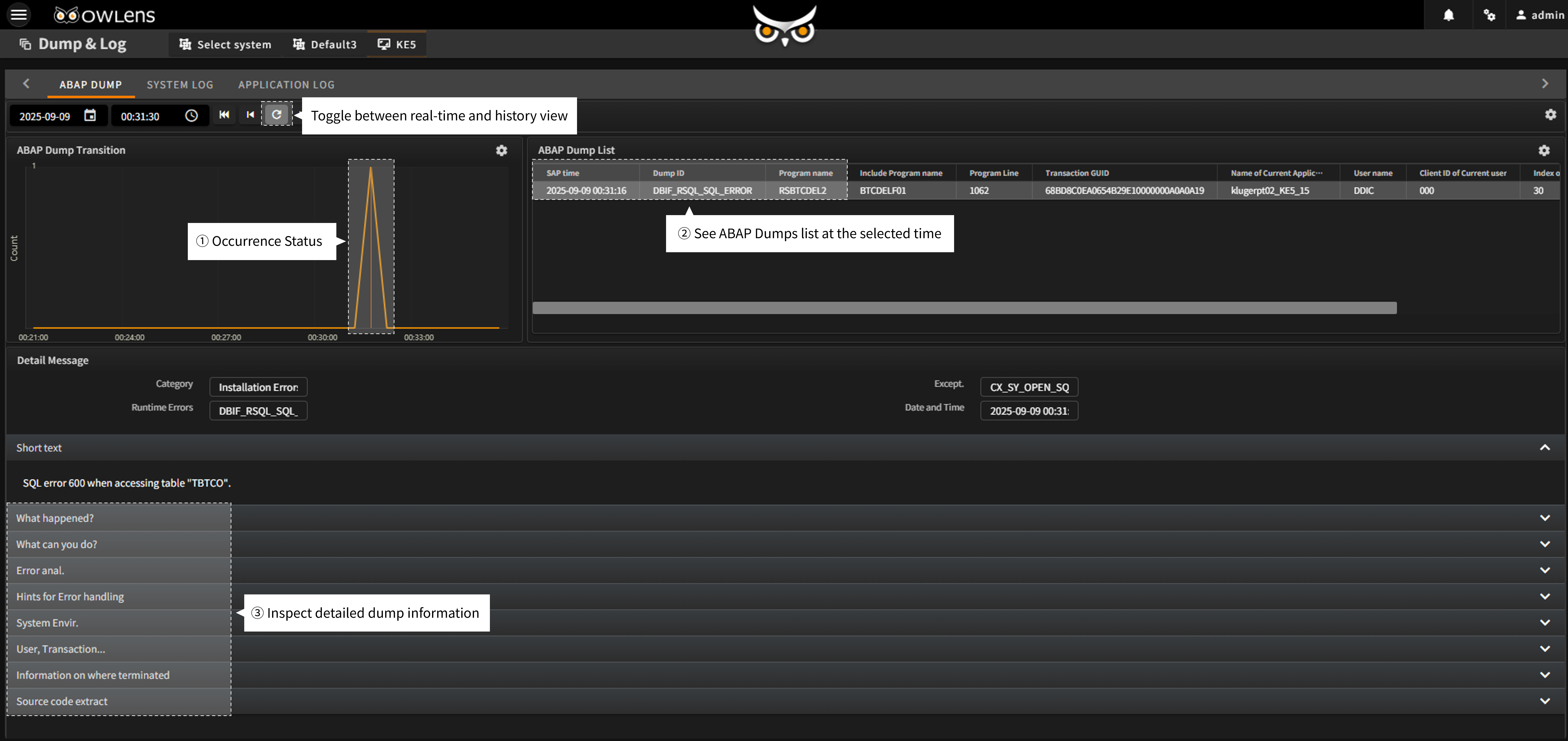 OWLens offers a feature that enables real-time monitoring and detailed analysis of ABAP Dumps.